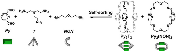近日,我?;瘜W學院Lehn功能材料研究所與法國斯特拉斯堡大學超分子科學與工程研究所合作,基于亞胺類動態(tài)共價反應(yīng)以及課題組對于組分動態(tài)網(wǎng)絡(luò)方面的前期研究基礎(chǔ),對有機籠狀與環(huán)狀化合物自分類組分動態(tài)網(wǎng)絡(luò)的設(shè)計和動態(tài)適應(yīng)性進行了深入研究。該研究首先以兩種多胺(T、NON)和二醛(Py)構(gòu)成的三元混合體系為原料,考察其自分類性能。理論上,各組分基元可以在體系中進行隨機的結(jié)合,產(chǎn)生由單一或混合組分基元所構(gòu)成的多元復(fù)雜體系。因此,在最簡單三元組分基元體系中(Py、T、NON),可能產(chǎn)生三種平衡態(tài):1)Py與T或NON選擇性結(jié)合,產(chǎn)生Py3T2和Py2(NON)2的同質(zhì)自分類(homo-self-sorting)結(jié)構(gòu);2)Py與T和NON同時結(jié)合,產(chǎn)生一種特定的異質(zhì)自分類(hetero-self-sorting)結(jié)構(gòu);3)Py與T,NON的反應(yīng)不具備選擇性,進而產(chǎn)生具有統(tǒng)計學分布的超復(fù)雜混合狀態(tài)。而實驗結(jié)果表明,該混合體系首先產(chǎn)生一系列的復(fù)雜中間體,隨后這些中間體有序的轉(zhuǎn)化為熱力學穩(wěn)定狀態(tài),生成有機籠狀化合物和大環(huán)的同質(zhì)自分類產(chǎn)物,即平衡態(tài)1),如圖2所示。