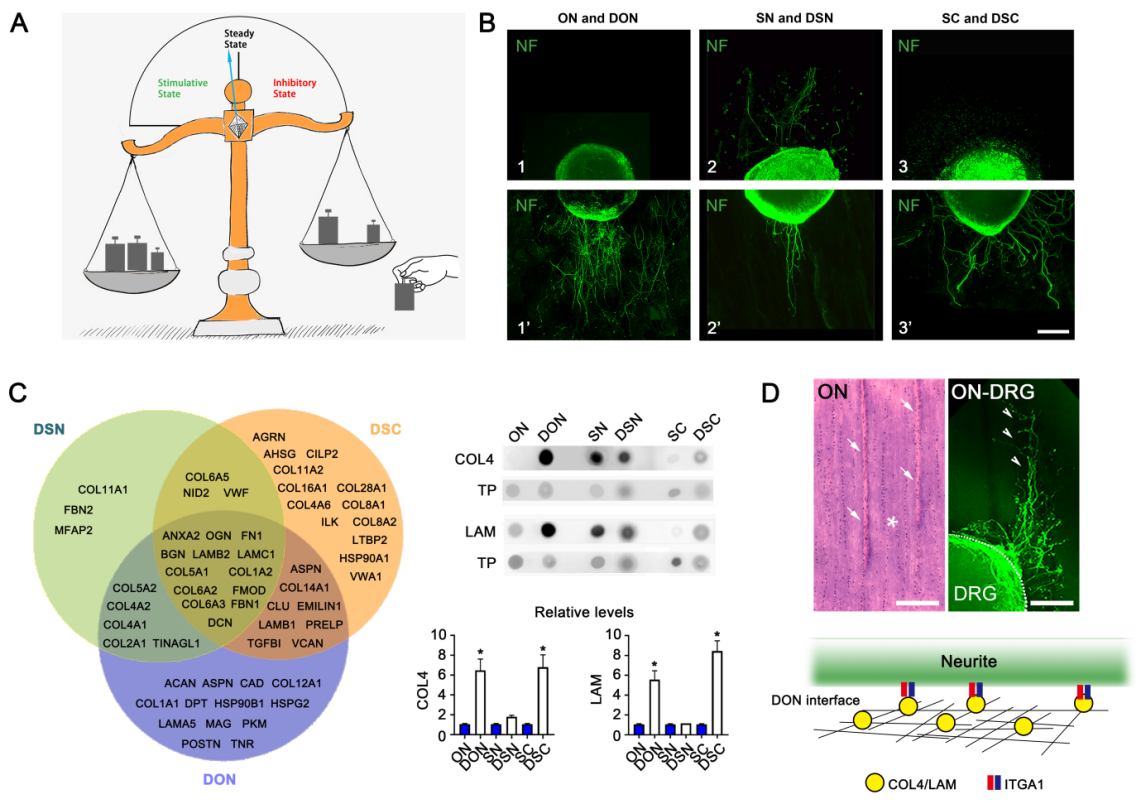 說明:A. 示意脫細胞技術改變了穩定態的中樞神經組織微環境。經脫細胞處理后中樞神經組織的細胞外基質的顯著變化是抑制神經再生成份減少,促使神經再生成份比例增多,導致其微環境由穩定態(steady state)轉變為促進態(stimulative state)。B. 示三種神經組織(ON, SN, SC)與其對應的去細胞神經組織(DON,DSN,DSC)縱切厚片對DRG神經突起生長的影響。C. 韋恩圖顯示三種去細胞神經組織(DON,DSN,DSC)所保留的細胞外基質蛋白成份。D. 示正常視神經(ON)縱切厚片結締組織隔膜(白箭示)與其支持DRG神經突起直行生長(白箭頭示)的關系;模式圖顯示去細胞視神經縱切厚片界面(DON interface)上的COL4/LAM與神經突起(Neurite)上的ITGA1之間的關系。
