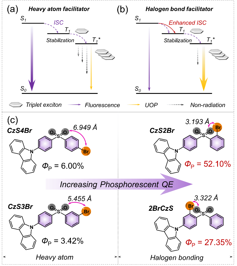 近日,中山大學化學學院池振國教授研究團隊提出了一種通過調節鹵素的取代位置以引入分子內鹵鍵來提高UOP材料QE的新策略。其中,CzS2Br的磷光效率高達52.10%,這是迄今為止報道的單組分有機長余輝效率最高值。通過系統地研究發現,作者指出分子內鹵鍵(intramolecular halogen bonding,分子內鹵氧相互作用)是獲得高效率UOP材料的關鍵所在。分子內鹵鍵不僅能夠通過促進自旋-軌道耦合以提高分子系間竄躍效率,還可以抑制激發態分子的振動和轉動,從而限制分子的非輻射躍遷。