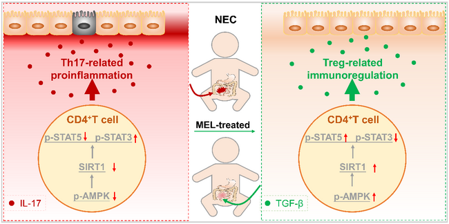 通過進一步研究發現,MEL防御Th17/Treg細胞失衡與活化AMPK/SIRT1信號通路有關。本研究不但為NEC的防御提供新的策略,更為其靶向治療提供了新的思路。