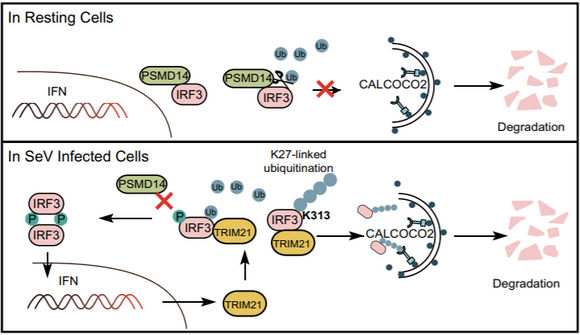 該研究發(fā)現(xiàn),在靜息態(tài)細(xì)胞中,去泛素化酶家族成員PSMD14能與IRF3結(jié)合,并依賴其酶活性去除IRF3上的K27泛素化,抑制IRF3降解并維持IRF3的本底表達(dá)。然而在病毒入侵過程中,IRF3發(fā)生磷酸化并活化,活化的IRF3與PSMD14解離,導(dǎo)致IRF3上的泛素化增強(qiáng)。而IRF3上的K27泛素化會(huì)成為選擇性自噬貨物識(shí)別受體NDP52/CALCOCO2的識(shí)別信號(hào),并被NDP52識(shí)別并帶入自噬體中降解,從而導(dǎo)致抗病毒免疫反應(yīng)的削弱。因此,在病毒入侵過程中,PSMD14通過調(diào)控IRF3上的動(dòng)態(tài)泛素化修飾,控制IRF3的選擇性自噬降解過程,從而平衡干擾素抗病毒免疫信號(hào)的激活與抑制。本研究不僅發(fā)現(xiàn)了IRF3在病毒入侵過程中動(dòng)態(tài)修飾與調(diào)控,也為抗病毒免疫通路與選擇性自噬的交互聯(lián)系提供了新的證據(jù)。