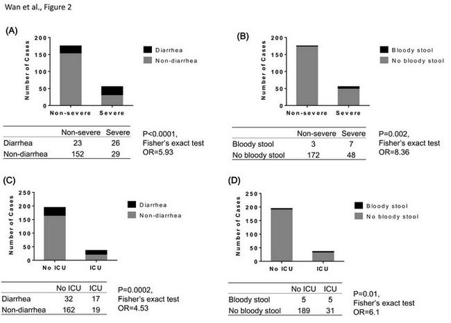 基于此,該團隊和湖北、廣東和江西的多個醫院建立了合作關系,收集了232位匿名新冠病人的病歷。在研究中發現,21%的新冠病毒感染者在住院期間出現了腹瀉癥狀,大大高于原先報道中的3%。同時,還發現很多新冠病毒感染患者有血便的癥狀。這些結果均支持了新冠病毒經由消化道的傳播機制。