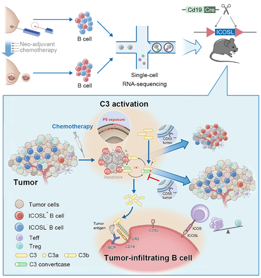 該研究收集了乳腺癌患者化療前后的腫瘤組織,從中分離出B細胞進行單細胞測序,發現化療后出現了一群以ICOSL+CR2highIL-10-CD20+CD38+CD27+IgA-IgD-為特征的B細胞。研究者進一步借助全視野數字化切片掃描及自動化分析方法,全面解析了患者腫瘤組織中B細胞的位置及表型,發現ICOSL+B細胞傾向于定位在化療后形成的三級淋巴樣結構中,并且它們的浸潤數目與患者的長期生存時間呈正相關。在此基礎上,研究者利用特異性敲除B細胞表達ICOSL及CR2基因的小鼠模型,證實ICOSL+B細胞的功能是激活T細胞相關的抗腫瘤免疫;該群細胞的產生機制是化療后腫瘤細胞免疫原性死亡引發的補體信號活化;而補體抑制蛋白在腫瘤中的表達,決定了化療后B細胞在不同腫瘤中相反的作用。具備抗腫瘤功能的B細胞以及相關機制中的調控分子,是乳腺癌免疫治療潛在的新靶點。