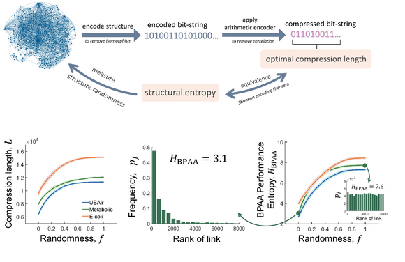 通過研究,該團(tuán)隊(duì)發(fā)現(xiàn)來(lái)自不同領(lǐng)域,很多大小不一的網(wǎng)絡(luò),其結(jié)構(gòu)的最短壓縮長(zhǎng)度和可預(yù)測(cè)性之間存在一個(gè)普遍的線性關(guān)系?;谙戕r(nóng)信源編碼定理,該團(tuán)隊(duì)在隨機(jī)網(wǎng)絡(luò)上證明了這種線性關(guān)系。