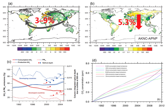 光學厚度及PM10的演變,(d)基于生產排放和消費排放分別模擬的1990-2012年中國、美國、歐盟的
