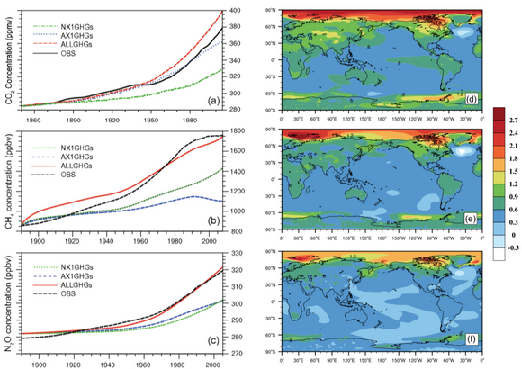 除了人為排放的CO2之外,最重要的人為溫室氣體還包括CH4和N2O等。CH4的重要性僅次于CO2,其排放量占全球人為溫室氣體排放總量的14%,百年全球增溫潛能 (GWP) 是CO2的21倍。其次,全球溫室氣體排放量的8%來源于人為化石燃料燃燒和化肥施用過程中產生的N2O,其GWP約是CO2的310倍。評估多種溫室氣體共同作用下的氣候變化,對于完善氣候變化的歷史責任歸因研究,為氣候談判提供詳實的理論依據具有一定的參考價值。