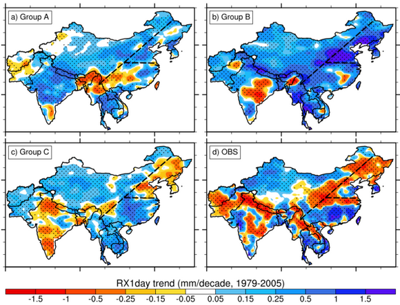 包含直接效應+第一間接效應+第二間接效應的氣候模式(c)和觀測數據(d)在中國和印度的1979-2005年極端降雨趨勢空間分布圖。
