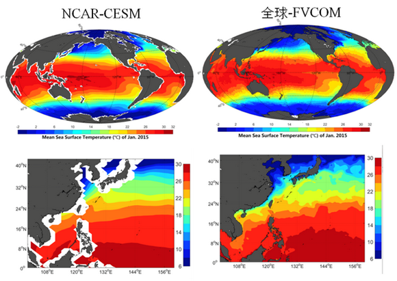 圖3. 2015年1月全球(上)及西太平洋(下)海表溫度,左為美國大氣研究中心-通過耦合地球系統模式模擬結