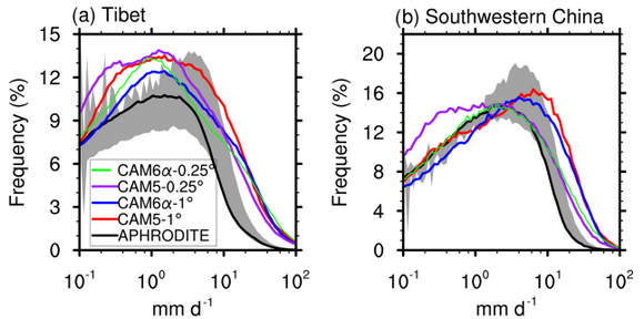 (黑線和灰色陰影區域)在青藏高原(a)和中國西南區域(b)的降雨概率分布圖。