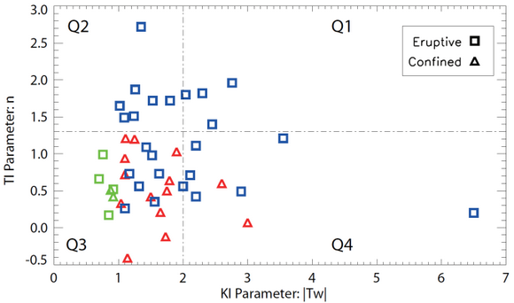 為了進一步理解導致爆發型和束縛型這兩種不同類型耀斑的關鍵因素,大氣科學學院段愛英副教授及合作者對2011年至2017年期間所有發生在太陽中心附近的M5.0級以上的耀斑進行了研究,利用磁場外推發現90%的事件在耀斑發生前存在磁繩結構,并且磁繩的三維結構比理論模型復雜得多。進一步的研究發現,當磁繩的torus不穩定性參數(即衰減因子)大于1.3或者kink不穩定性參數(即磁力線纏繞度)大于2時,90%以上的事件是爆發型耀斑;而且在所有事件中,利用以上兩個參數可以成功判斷70%耀斑事件的類型。因此,這兩個參數及其閾值可以為預報耀斑是否爆發提供重要參考。