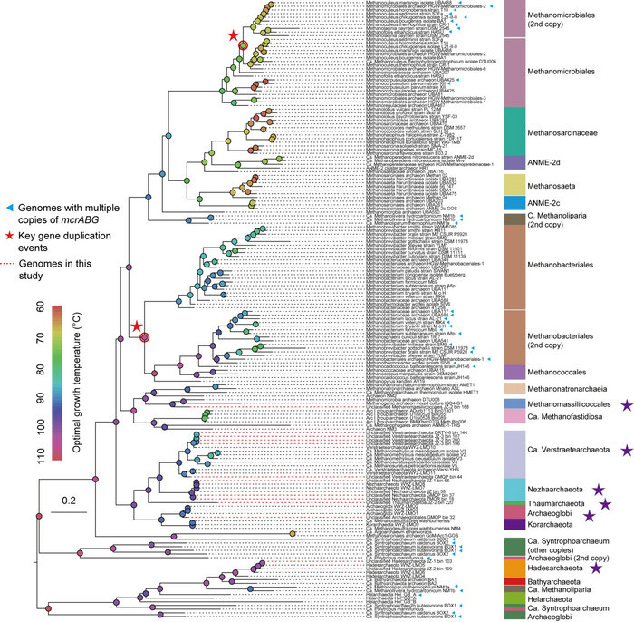 近期,我校生命科學(xué)學(xué)院李文均教授課題組在國際知名學(xué)術(shù)期刊Nature Communications發(fā)表題為“Insights into ecological roles and evolution of methyl coenzyme M reductase containing hot spring Archaea”的學(xué)術(shù)論文。研究表明:滇藏?zé)崛鷳B(tài)系統(tǒng)中蘊(yùn)含著豐富的微生物資源,包含大量的系統(tǒng)發(fā)育位置未知且功能奇特的神秘、新穎的微生物類群。課題組結(jié)合宏基因組學(xué)測序技術(shù)和生物信息學(xué)手段從中重構(gòu)出14個(gè)具有甲烷/烷烴代謝能力的微生物基因組(圖1),其系統(tǒng)發(fā)育多樣性極高且獨(dú)特,廣泛分布于韋斯特古菌門、哪吒古菌門(Nezharchaeota)等TACK超級門中。值得一提的是,該課題組首次于奇古菌門(Thaumarchaeota)中發(fā)現(xiàn)其具有產(chǎn)甲烷功能。此前,奇古菌門以其好氧氨氧化能力而為眾人所熟知,而課題組首次對其厭氧狀態(tài)下產(chǎn)甲烷能力的發(fā)現(xiàn)表明我們目前對此門認(rèn)知的局限性,神秘的自然界或?qū)⑦h(yuǎn)遠(yuǎn)超出我們的認(rèn)知。此外,組學(xué)技術(shù)的發(fā)展或?qū)⒅敢覀儗ζ溥M(jìn)化歷史進(jìn)行更全面的認(rèn)知。課題組對這些未知生命的代謝特征進(jìn)行了揭示,并發(fā)現(xiàn)除卻傳統(tǒng)的氫營養(yǎng)型產(chǎn)甲烷菌外,還有多種氫依賴的甲基營養(yǎng)性產(chǎn)甲烷菌,他們可吸收熱泉生態(tài)系統(tǒng)中多種甲基底物以完成甲烷的產(chǎn)生(圖2)。通過進(jìn)化基因組分析,課題組還對古菌祖先的進(jìn)化起源進(jìn)行了推測,研究發(fā)現(xiàn)對于具有產(chǎn)甲烷能力的微生物類群,其甲烷代謝關(guān)鍵基因mcrABG相對較為保守,并無明顯的水平基因轉(zhuǎn)移時(shí)間發(fā)生;而對于烷烴氧化的微生物類群,水平基因轉(zhuǎn)移對其多樣性塑造有著深遠(yuǎn)影響。基于甲烷代謝基因的保守性,課題組對其祖先序列進(jìn)行了序列重構(gòu),從而來推測祖先序列的最適生長溫度,結(jié)果表明具有mcrABG標(biāo)記基因的微生物類群或起源于高溫生境(圖3)。另外,由于 TACK和ASGARD超級門中,以及廣古菌門中大部分支系均具有甲烷/烷烴代謝能力,且相應(yīng)微生物相比其它同支系微生物有著更為悠久的進(jìn)化歷史(圖1),因此,課題組猜測地球早期生命中,古菌的祖先或具有甲烷和烷烴代謝能力。