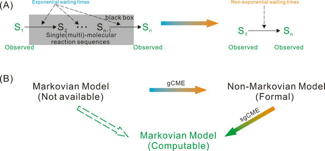 該研究解決了生化反應(yīng)系統(tǒng)(包括生物分子網(wǎng)絡(luò))研究領(lǐng)域中的一個長期未解決的問題,即如何建模和分析帶有分子記憶的生化反應(yīng)系統(tǒng)。為此,作者創(chuàng)新性地建立起一套實用理論,其核心是靜態(tài)廣義化學(xué)主方程,它把一個非馬氏問題轉(zhuǎn)化為一個馬氏問題,并由此揭示出非馬氏生化反應(yīng)系統(tǒng)的本質(zhì)特性。