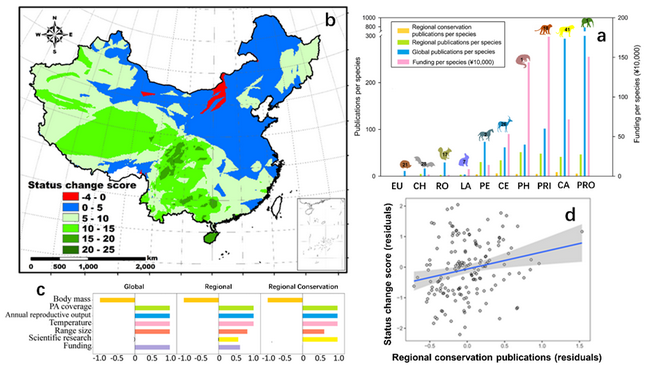 d)保護相關的地區性科學研究論文數量與受脅陸生哺乳動物瀕危等級變化之間的偏相關回歸關系