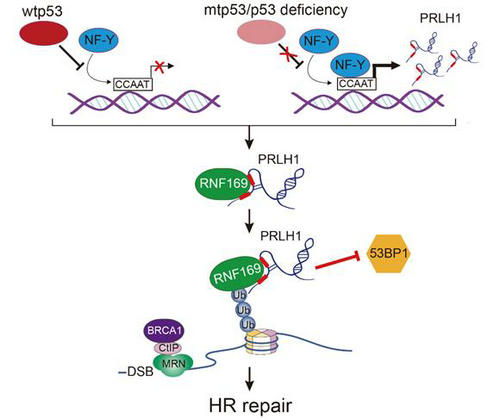 在人類基因組中,逆轉(zhuǎn)座子元件及其衍生物的序列約占40%,其中10%為LTR逆轉(zhuǎn)座子。雖然大部分LTR 逆轉(zhuǎn)座子都具有產(chǎn)生轉(zhuǎn)錄本的潛能, 但是一直被認(rèn)為是垃圾DNA和寄生轉(zhuǎn)錄產(chǎn)物,它們在重要細(xì)胞生物學(xué)過程中的作用并不清楚。屈良鵠教授課題組采用RNA組學(xué)技術(shù),從肝癌TCGA數(shù)據(jù)中鑒定并命名了一個與p53突變相關(guān)的、由LTR12C家族衍生的LTR-lncRNA成員PRLH1。該研究發(fā)現(xiàn),PRLH1可與DNA修復(fù)蛋白RNF169特異性結(jié)合,形成一個穩(wěn)定的RNA-蛋白質(zhì)機(jī)器,通過排除DSB位點(diǎn)的53BP1蛋白(非同源重組修復(fù)關(guān)鍵蛋白),啟動DNA同源重組修復(fù)(HR)。在這一過程,PRLH1對RNF169的穩(wěn)定性至關(guān)重要。研究還發(fā)現(xiàn),p53可通過NF-Y通路抑制PRLH1在肝癌中表達(dá)及其介導(dǎo)的HR修復(fù)。p53突變將導(dǎo)致癌細(xì)胞同源重組激活,成為癌細(xì)胞抵抗凋亡及耐藥性的基礎(chǔ),該研究首次揭示了p53通過lncRNA轉(zhuǎn)錄調(diào)控這種新的作用方式來抑制HR修復(fù)(如下圖)。