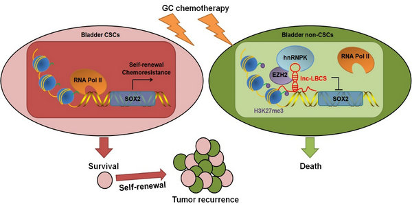 該研究首次發(fā)現(xiàn)lncRNA LBCS在膀胱癌干細(xì)胞的自我更新和化療耐藥中發(fā)揮重要的抑癌基因作用,上調(diào)LBCS能抑制膀胱癌成瘤和增加化療敏感性。LBCS-hnRNPK-EZH2-SOX2調(diào)控軸有望成為干預(yù)膀胱癌化療耐藥的新治療靶點(diǎn)。本研究為靶向膀胱癌干細(xì)胞治療和提高膀胱癌化療敏感性提供科學(xué)依據(jù)和新思路。