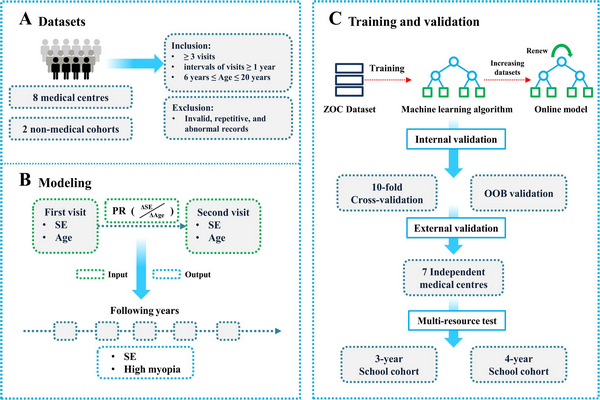 既往青少年近視眼研究數據量小,無法完全反映其發展規律,因此不能有效進行預測及早期精準干預。近視眼一旦發展為高度近視,可導致視網膜變性、脫離等不可逆損害,嚴重影響孩子們的身心健康。如果能夠在早期預測其發展規律,通過增加戶外活動等早期干預手段,就可減緩近視眼的發生發展,對降低高度近視的風險有重要意義。