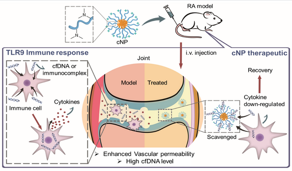 類風濕性關節炎(Rheumatoid Arthritis, RA)是一種常見的慢性自身免疫疾病,其發病率約占世界人口的1%。自身抗原激起免疫系統釋放的細胞因子侵蝕關節骨和軟骨,導致骨變形、關節腫脹,嚴重影響患者生活和工作。目前其臨床治療主要是采用包括甲氨喋呤等抗風濕藥物(DMARD)和抗TNF-?抗體等抗體類生物藥物,但存在毒副作用、影響免疫系統、價格昂貴等嚴重問題,因此尋求新的治療RA策略依然是重大挑戰。近年的研究表明,患者關節積液中的cfDNA濃度異常高,而游離核酸又可被免疫細胞的TLR樣受體識別,產生非正常的免疫反應。
