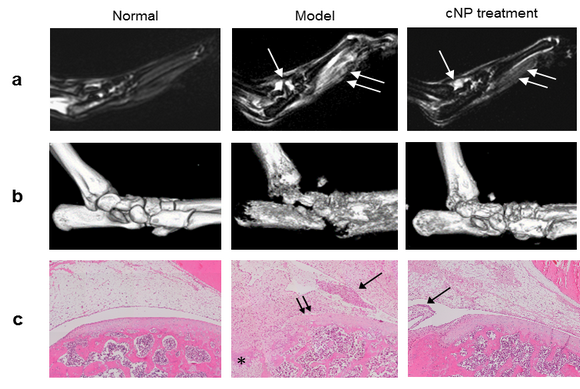 cNP治療后大鼠模型的軟組織(a. 后掌MRI影像)、骨質量(b. 踝關節microCT影像)和炎癥浸潤改善(c. HE染色)的結果