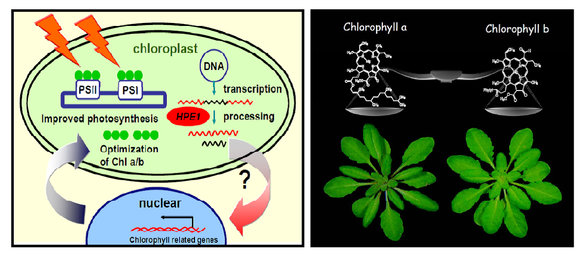 王宏斌教授團隊通過大規模篩選,鑒定到一個重要的光效調控基因HIGH PHOTOSYNTHETIC EFFICIENCY 1(HPE1)。研究發現HPE1基因編碼一個新的葉綠體RNA剪接因子,其缺失改變了細胞核編碼的葉綠素相關基因的表達,從而優化了捕光色素,最終增加了光捕獲能力和光合作用量子產量,提高了實際光合作用效率。該工作提示了一種光效優化的新策略。該研究論文于2016年11月發表于《Plant Physiology》(November 2016,Vol. 172,pp. 1720–1731,IF5-Yr=8.030)。靳紅磊博士為第一作者,王宏斌教授和王金發教授為共同通訊作者。相關工作得到了農業部轉基因專項、國家杰出青年科學基金等的資助。