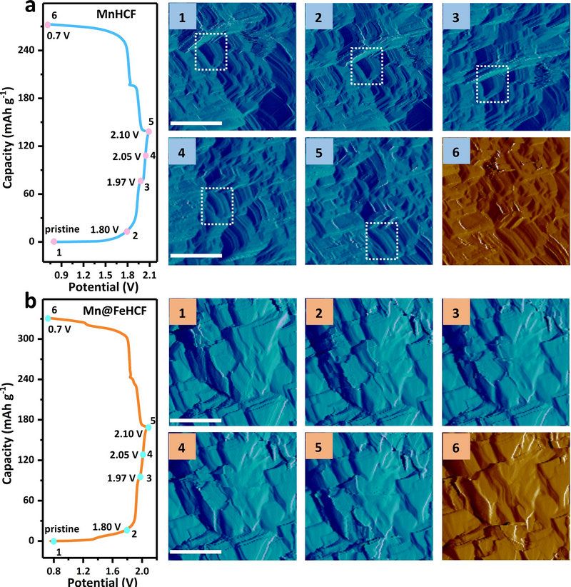 有別于傳統單金屬活性中心普魯士藍材料外延層,具有雙金屬活性中心的FeHCF能夠在不損失復合材料比容量的前提下,實現對核心MnHCF姜泰勒畸變的有效抑制。該復合材料在100 mA g–1的電流密度下,輸出高達166 mA h g–1的可逆比容量,已接近該類材料的理論值(~170 mA h g–1),且經過400圈仍可維持72.4%的比容量。通過系統表征材料在充放電過程中離子的嵌脫機理和晶格變化,結果表明作為殼層的FeHCF的晶格變形程度遠小于核心MnHCF。結合拉曼光譜和穆斯堡爾譜分析研究發現,鋅離子的嵌入會引起FeHCF的原位表面非晶化,最終形成由非晶/晶體FeHCF包覆MnHCF的“核-雙殼”結構復合材料。非晶材料具有無定形結構,通常具有較好的韌性、強度和耐腐蝕性。因此,由非晶和低應變晶體構建的雙重殼層結構對核心材料起到了很好地保護作用,大幅提升了電池的循環穩定性能。此外,該團隊首次利用原位電化學原子力顯微鏡實時觀察電池反應中電極的表面形貌變化(見圖2),結果表明“核殼”結構復合材料具有更小的體積形變,進一步驗證材料結構設計的合理性。