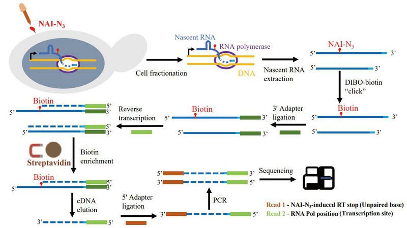 團隊采用小分子藥物NAI-N3對釀酒酵母細胞內(nèi)RNA上的單鏈位點進行特異性標記,同時富集轉(zhuǎn)錄中的新生RNA,最后通過高通量測序的方法確定轉(zhuǎn)錄進程以及對應的RNA二級結構(圖1)。實驗數(shù)據(jù)提示,新生RNA的二級結構常常隨著轉(zhuǎn)錄的進行而出現(xiàn)動態(tài)變化,但最終形成的結構與細胞質(zhì)中的成熟RNA整體較為相似。