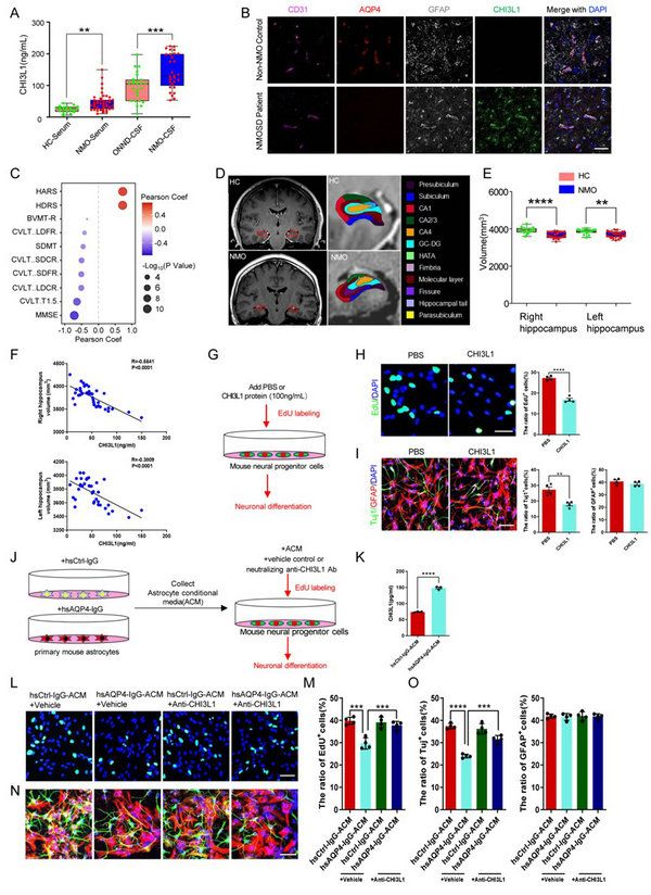 中大新聞網訊(通訊員姜維)近日,中山大學附屬第三醫院腦病中心邱偉/湯常永團隊在國際知名期刊Science Advances發表了題為“CHI3L1 signaling impairs hippocampal neurogenesis and cognitive function in autoimmune-mediated neuroinflammation”的研究論文。該研究發現NMOSD患者血液和腦脊液中CHI3L1的表達水平顯著升高,并與認知功能障礙相關評分存在相關性。