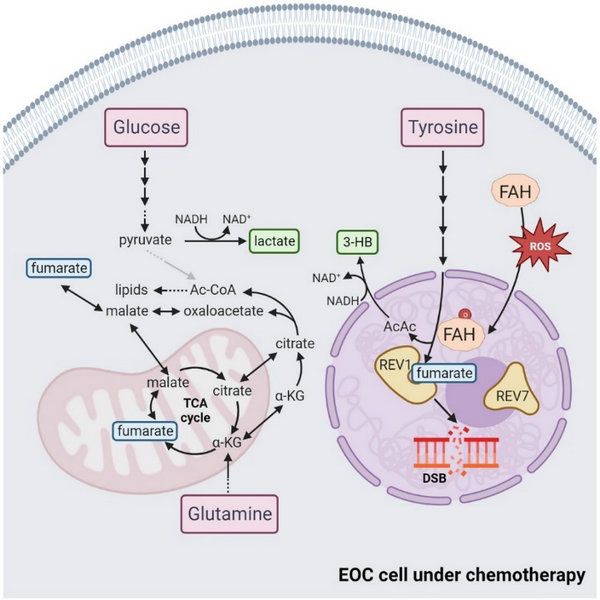 利用卵巢癌疾病模型,該團(tuán)隊(duì)首次發(fā)現(xiàn)酪氨酸分解代謝顯著增強(qiáng)化療效果,并揭示化療壓力下卵巢癌腫瘤細(xì)胞中的FAH代謝產(chǎn)物富馬酸通過在核內(nèi)結(jié)合REV1而抑制了跨損傷DNA合成(translesion DNA synthesis, TLS),進(jìn)而促進(jìn)基因毒性化療藥物敏感性的分子機(jī)制,提出了通過添加膳食酪氨酸改善卵巢癌患者化療的新思路,值得進(jìn)一步臨床試驗(yàn)驗(yàn)證。
