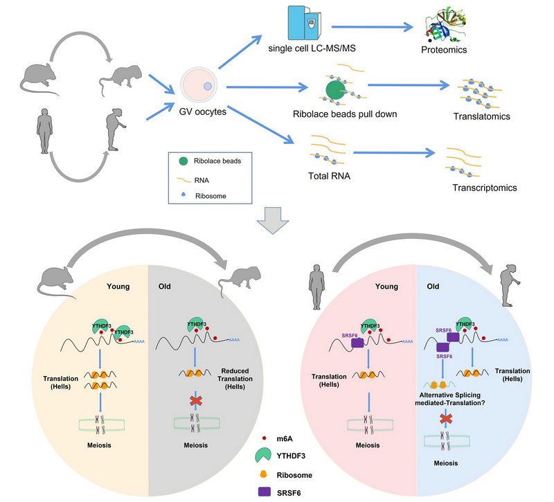 研究團隊使用新的單細胞雙組學測序技術(T&T-seq)發現,在小鼠衰老過程中,卵母細胞中大多數基因的翻譯效率顯著降低,并且與M6A識別因子YTHDF3的表達下降相關。干預YTHDF3影響了卵母細胞中HELLS基因的翻譯效率,進而抑制了卵母細胞成熟。此外,團隊進一步分析了人類卵母細胞衰老過程中的翻譯圖譜,發現人與小鼠在翻譯圖譜和翻譯調控過程中存在不同。雖然在人類和小鼠卵母細胞衰老過程都觀察到減數分裂、DNA甲基化及RNA降解的調節因子相似的翻譯變化,但是人類卵母細胞衰老過程中的翻譯調控因為YTHDF3表達很低,因此并非由M6A介導,而與剪接因子SRSF6相關。這提示,在臨床上改善生殖衰老,增加高齡卵母細胞的獲取和改善高齡卵母細胞的質量,應該著手于人的研究,其中可變剪切調控可能是改善人卵母細胞老化的關鍵步驟。測序技術的更新為有限的人的樣本提供了更多有力支持,將為我們進一步改善臨床上老化卵母細胞的培養提供新的可能。