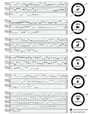 圖2. 六個后生動物類群(十足目、腹足綱、脊椎動物亞門、蜘蛛目、異翅亞目、鱗翅目)引物集的PCR擴增試驗結果