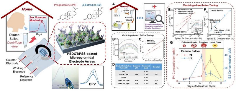 近期,中山大學(xué)材料科學(xué)與工程學(xué)院謝莊副教授課題組提出了一種三維微結(jié)構(gòu)柔性電極策略,實(shí)現(xiàn)了低成本亞飛摩級(jí)的性激素電化學(xué)免疫傳感。該傳感器能夠直接檢測(cè)高度稀釋的唾液樣本中的激素,無需使用離心等儀器,從而便于在家中進(jìn)行唾液測(cè)試和監(jiān)測(cè)整個(gè)女性月經(jīng)周期中的唾液P4和E2。傳感器的核心是基于在微金字塔陣列涂覆摻雜三氟甲烷磺酰胺鋰(LiTFSI)的聚(3,4-亞乙基二氧噻吩):聚(4-苯乙烯磺酸鹽)(PEDOT:PSS)的導(dǎo)電高分子電極及結(jié)合金納米粒子(AuNPs)以促進(jìn)激素抗體的固定。這種簡(jiǎn)單的免疫傳感工作電極通過微針尖促進(jìn)分子擴(kuò)散富集,可以在幾分鐘內(nèi)經(jīng)由微分脈沖伏安法(DPV)的峰值電流下降,實(shí)現(xiàn)P4和E2在亞fM到μM水平的高靈敏寬范圍電化學(xué)檢測(cè)。