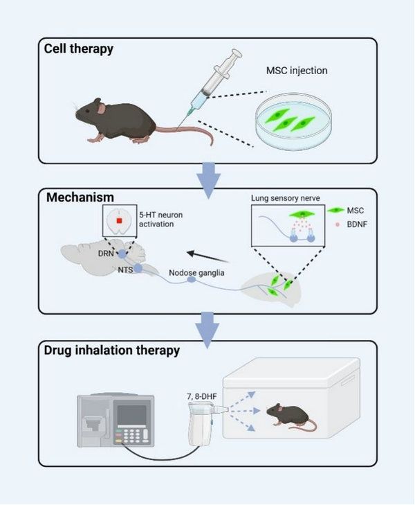 為了回答這一問題,中山大學中山醫學院項鵬教授和張小然副教授團隊開展研究,近日在Nature Communications上發表了題為“Mesenchymal stromal cells alleviate depressive and anxiety-like behaviors via a lung vagal-to-brain axis in male mice”的論文,研究揭示了MSC通過肺迷走傳入神經→孤束核→中縫背核神經通路發揮抗抑郁和抗焦慮作用。