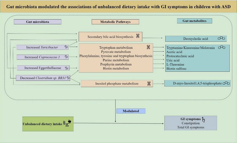 ASD兒童并發(fā)的胃腸道癥狀最初受到關(guān)注是因?yàn)樗麄冊(cè)庥龅奈桂B(yǎng)問題,研究報(bào)道ASD兒童出現(xiàn)喂養(yǎng)問題的可能性是正常發(fā)育(TD)兒童的5倍。我們的最新研究也表明,ASD兒童膳食不平衡是胃腸道癥狀的獨(dú)立危險(xiǎn)因素。飲食可快速改變微生物群組成和動(dòng)態(tài)平衡。有研究表明,飲食誘導(dǎo)的多種疾病癥狀可由變化的腸道菌群所介導(dǎo),這提示自閉癥改變的腸道菌群是否可調(diào)節(jié)其飲食與胃腸道癥狀之間的關(guān)系?此外,腸道菌群可產(chǎn)生多種代謝產(chǎn)物,如膽汁酸、短鏈脂肪酸(SCFAs)、色氨酸代謝物和甲烷等,它們對(duì)胃腸功能具有重要影響,這進(jìn)一步提示由腸道菌群產(chǎn)生的代謝產(chǎn)物是否會(huì)驅(qū)動(dòng)ASD兒童并發(fā)的胃腸道癥狀?