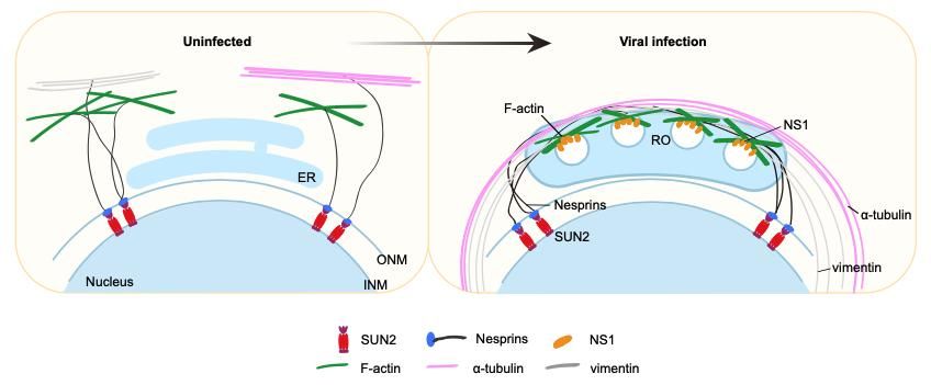 最后,研究人員利用病毒感染的乳鼠模型,證實SUN2敲除使得寨卡病毒在動物體內的復制、傳播和致病力都大大減弱。綜上所述,該論文闡明了核膜蛋白SUN2促病毒的機制是:SUN2與Nesprins共同作用,促進NS1-actin誘導的細胞骨架重塑和復制囊泡的形成,調控黃病毒RNA的合成(圖1)。這也提示除了細胞質骨架,細胞骨架系統的其它蛋白(如核膜蛋白SUN2和Nesprins)也是黃病毒復制的關鍵因子。