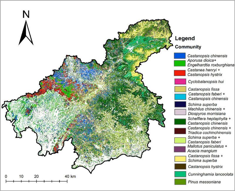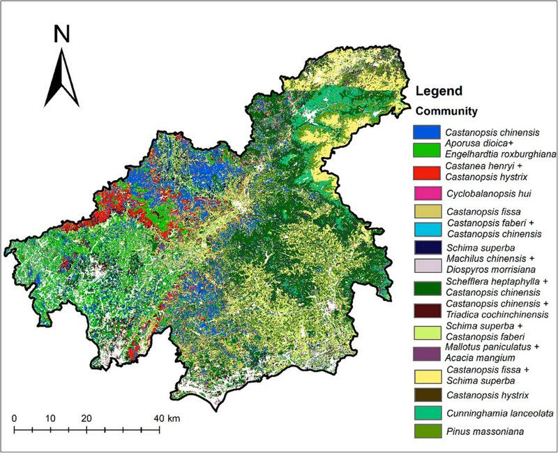 森林是地球陸地上最主要的自然生態(tài)系統(tǒng)類型。森林覆被格局的現(xiàn)狀是歷史過程的結(jié)果。受自然和人為因素的影響,區(qū)域性的森林景觀及結(jié)構(gòu)總是處于不斷變化的動態(tài)過程。無論是在全球性還是區(qū)域性的范圍內(nèi),森林覆被的變化與環(huán)境變化之間都存在著復(fù)雜的非線性動態(tài)反饋關(guān)系。因此,重建歷史森林景觀的格局,建立長時間序列的森林景觀圖譜,對于研究森林對生態(tài)環(huán)境的影響及其對氣候的響應(yīng)機(jī)制具有重要意義。目前國際上大多數(shù)重構(gòu)研究采用的算法較為簡單,獲取的空間分布信息分辨率不高,精度驗(yàn)證結(jié)果不甚理想。針對這一問題,余世孝教授課題組聯(lián)合了中國林業(yè)科學(xué)研究院李意德和周璋研究員、中國科學(xué)院華南國家植物園曹洪麟研究員以及華南農(nóng)業(yè)大學(xué)唐光大教授等課題組,在對廣州市北部地區(qū)森林植被進(jìn)行大范圍調(diào)查的基礎(chǔ)上,結(jié)合遙感判別和聚類分析方法對該區(qū)域的主要森林群落進(jìn)行劃分,基于氣象因子、地形因子、與各個土地利用類型的最近距離、回溯起始年份的森林群落空間分布數(shù)據(jù)等要素,結(jié)合AdaBoost算法(用弱分類器的線性組合構(gòu)造強(qiáng)分類器)改進(jìn)的人工神經(jīng)網(wǎng)絡(luò)(Artificial Neural Network,ANN)和自然林地的分布關(guān)系,創(chuàng)建了一個基于元胞自動機(jī)(Cellular Automaton,CA)的空間演化模型來重建歷史森林的空間格局,使用CA-AdaBoost-ANN對廣州市北部地區(qū)的2000年和1990年的森林群落進(jìn)行重建(圖1和圖2),且與廣州市北部地區(qū)森林群落的實(shí)際分布有很高的吻合度。研究文章所提出的CA-AdaBoost-ANN模型能揭示外部環(huán)境和演替內(nèi)因驅(qū)動下的歷史森林格局,特別是能在種群和群落水平上重建歷史時期的森林景觀圖譜。研究結(jié)果可為森林經(jīng)營管理提供理論依據(jù),也為預(yù)測未來森林格局演變提供了有效手段。