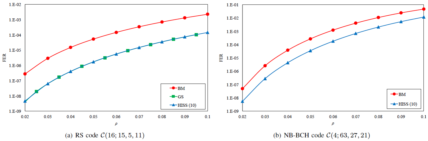 圖1給出了兩種多元循環碼 — RS碼和多元BCH碼在Q元對稱信道(QSC)下的譯碼性能。基于圖中顯示,迭代移加譯碼(HISS)相比BM譯碼可以獲得十至百倍的糾錯性能提升,實現了超限譯碼。該研究開啟了循環碼超限譯碼的全新路徑,并由于其計算操作簡單,可望在將來獲得更大的工業應用。