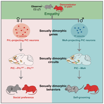 綜合以上結(jié)果,該研究發(fā)現(xiàn),在目睹同伴經(jīng)歷疼痛時,同伴的體液氣味在雌雄小鼠中激活了不同的神經(jīng)環(huán)路;在雌性小鼠中激活的PiC→PrL環(huán)路引起共情性社交親近行為;在雄性小鼠中激活的PiC→MeA環(huán)路引起共情性自我梳理行為。這兩條環(huán)路激活程度的差異由其基因表達模式上的性別差異所致。