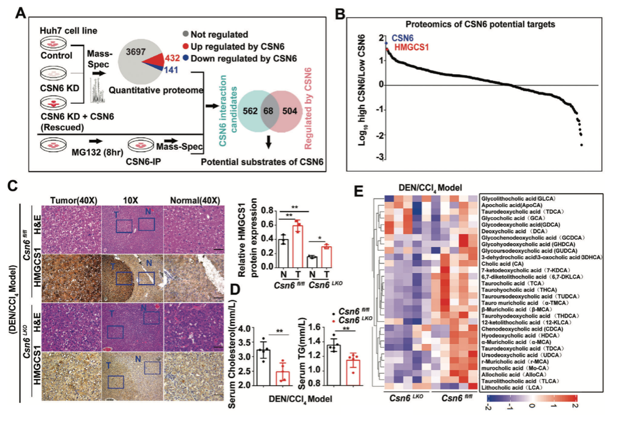 研究團隊采用大數據進行聯合肝癌組織微陣列免疫組化分析,發現CSN6在腫瘤組織中表達上調且與病人生存率低顯著相關。進一步,采用CRISPR-Cas9基因編輯系統構建肝臟特異性CSN6基因敲除小鼠,通過構建原位肝癌自發模型,研究團隊發現肝臟特異性敲除CSN6可抑制肝臟腫瘤生長,并降低小鼠血液膽固醇水平,這提示CSN6在肝癌發生發展中發揮重要作用。