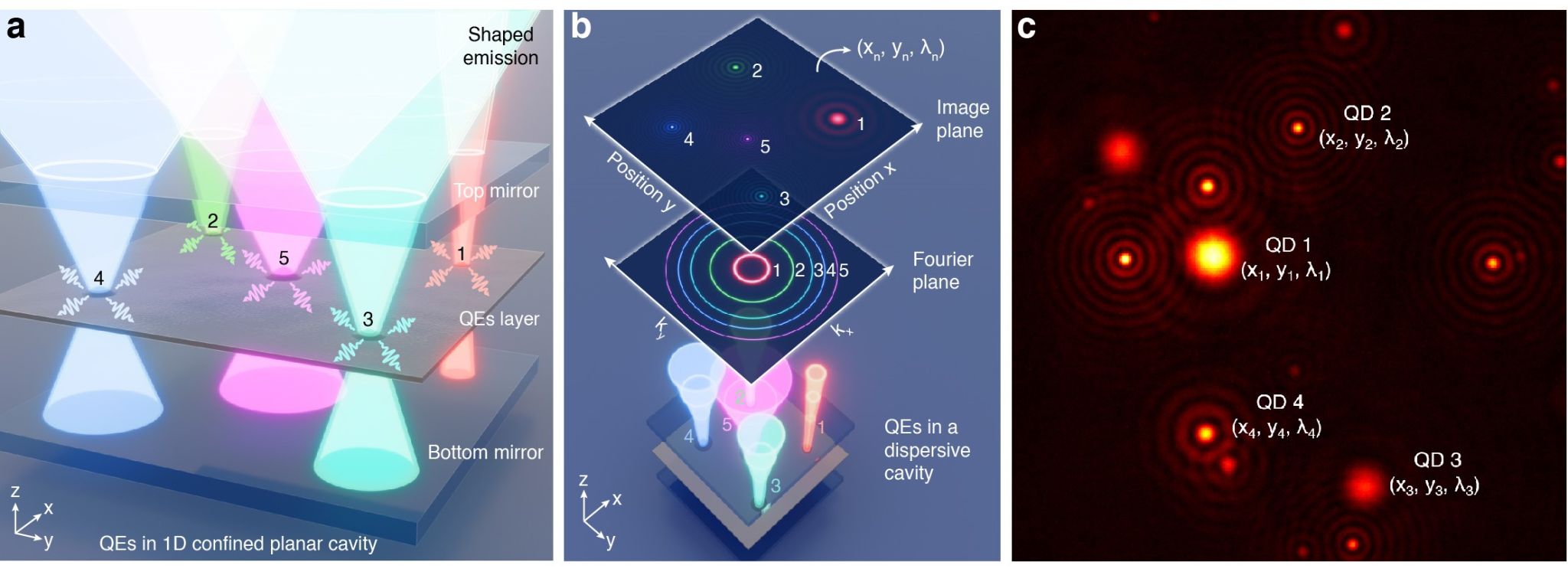 量子輻射子與微納光子結構的確定性耦合對于探索光與物質的相互作用、制備高性能的光量子器件、構建可擴展的光量子集成芯片等至關重要。然而, 量子輻射子的空間位置與光譜的隨機性往往導致其與微納光子結構模式的失配, 嚴重阻礙了高性能量子光源的實現及應用。精準確定每個量子輻射子的空間位置和輻射波長是解決這一重大挑戰的關鍵,為此,中山大學王雪華/劉進教授研究團隊,提出和開發了量子輻射子的超分辨和高光譜快照式熒光成像方法與技術,它能同時對大量的量子點進行高精度的空間定位和光譜分辨,并基于該技術實現了高性能微腔量子光源器件的規模化確定性制備。這一技術巧妙利用納米光子平面微腔的色散關系對量子點遠場熒光輻射的調控作用,僅通過單次成像便可同時獲取多個量子點的空間位置信息和光譜信息,其空間定位與波長分辨精度分別達到15 nm 和0.4 nm。這項研究突破了傳統成像技術只能獲取量子點位置信息的限制,解決了量子點與微納光子結構無法確定性耦合的難題,可為量子輻射子的快速全面表征、光量子功能器件的批量制備、可擴展光量子芯片的研發、超分辨生物成像等提供關鍵技術支撐,將進一步推動量子信息技術與經典光學成像技術的發展。