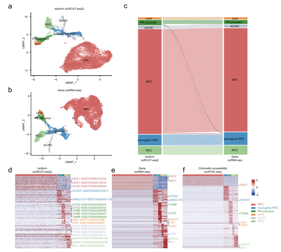 2024年9月13日,中山大學中山眼科中心胡友金教授團隊在Nature Communications雜志在線發表了題為“Simultaneous profiling of RNA isoforms and chromatin accessibility of single cells of human retinal organoids”的研究論文,報道了一種名為scRICA-seq (single-cell RNA isoform and chromatin accessibility sequencing) 的單細胞多組學測序方法,該技術能夠同時檢測單細胞水平染色質可及性、RNA表達,以及 isoform全長結構,實現了單個細胞水平的表觀遺傳學、轉錄與RNA剪接的整合分析,為揭示視網膜神經元發育和再生的新機制提供技術支撐。