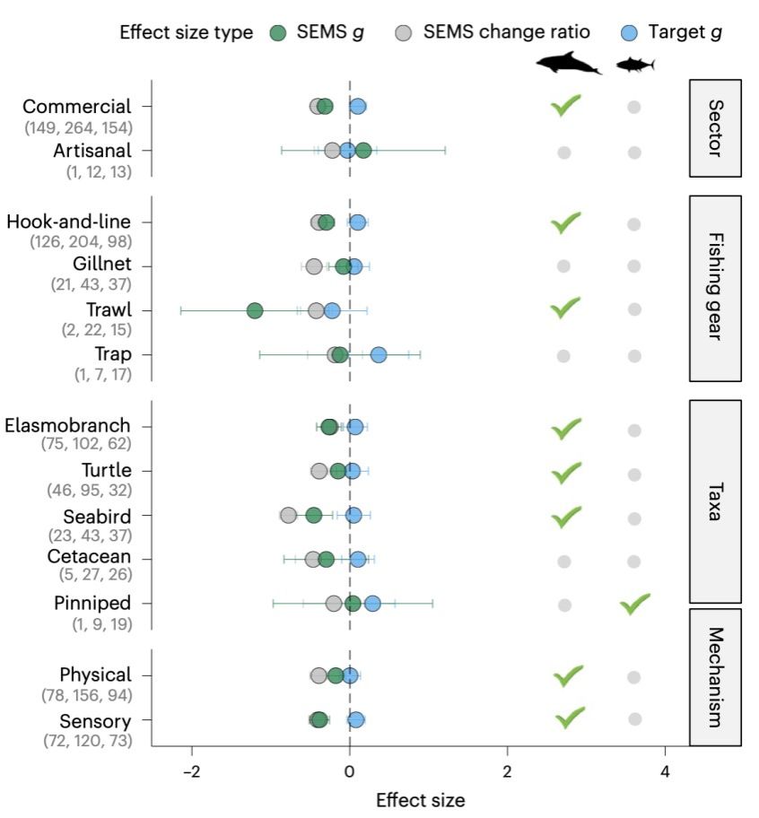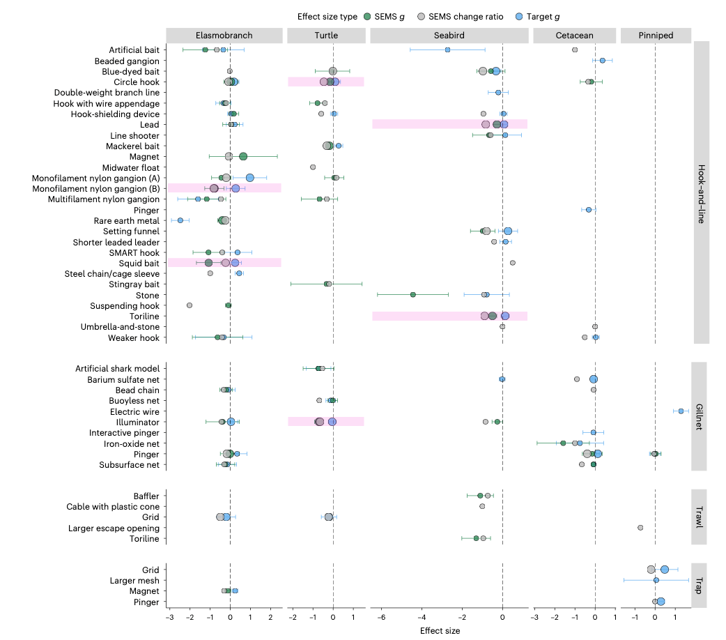 近日,由中山大學(xué)生態(tài)學(xué)院和水產(chǎn)動(dòng)物疫病防控與健康養(yǎng)殖全國重點(diǎn)實(shí)驗(yàn)室領(lǐng)銜的國際團(tuán)隊(duì)在環(huán)境科學(xué)與生態(tài)學(xué)領(lǐng)域頂級(jí)期刊Nature Sustainability發(fā)表題為“Effects of fishery bycatch-mitigation measures on vulnerable marine fauna and target catch”的研究論文。該研究在全球尺度,系統(tǒng)性量化評(píng)估了減少誤捕的技術(shù)性措施對(duì)漁業(yè)的目標(biāo)漁獲以及脆弱海洋動(dòng)物的影響。該研究發(fā)現(xiàn):總體來看,這些技術(shù)性措施可顯著減少捕撈作業(yè)對(duì)脆弱海洋動(dòng)物的誤捕事件,同時(shí)對(duì)目標(biāo)漁獲無顯著影響。