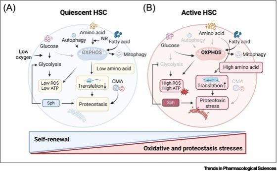 2024年9月20日,文卓謙教授與趙萌教授在《Cell》雜志子刊《Trends in Pharmacological Sciences》上發表了一篇題為《Metabolic Regulation in Normal and Leukemic Stem Cells》的綜述文章。該文章結合兩位教授課題組的最新研究成果與國內外相關報道,系統梳理了細胞代謝如何精細調控造血干細胞(HSC)的代謝活動和功能維持的機制。文章詳細探討了HSC在增殖與衰老過程中如何通過葡萄糖、氨基酸及脂質代謝調控自噬、氧化還原反應和蛋白質穩態等細胞應激反應的分子機制,同時探討了相關的臨床干預策略。