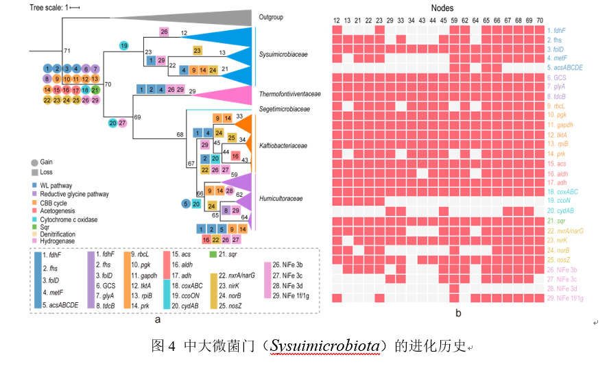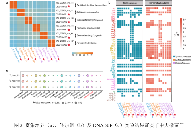 本研究從熱泉原始樣品的宏基因組數(shù)據(jù)中重構(gòu)了CSP1-3類群的基因組,結(jié)合NCBI數(shù)據(jù)庫中的基因組,最終選取112條完整度大于80%,污染度小于5%的CSP1-3類群基因組進行分析。系統(tǒng)發(fā)育結(jié)果顯示,這112條基因組所代表的菌株屬于同一門,可劃分為5個不同的科,11個屬和25個種(圖1)。這些基因組所代表的菌株廣泛分布于世界各地,土壤和熱泉是適合該類群生存的生境(圖1)。基因組分析結(jié)果顯示,該門類群的菌株是兼性厭氧微生物,能通過還原性甘氨酸途徑(RGP)、卡爾文循環(huán)(CBB)和伍德-永達爾通路(WLP)進行碳固定實現(xiàn)自養(yǎng)生長,氫化酶的存在及硫化物的氧化是自養(yǎng)生長過程中主要的能量來源(圖2)。采用自養(yǎng)培養(yǎng)基在厭氧條件下對CSP1-3類群進行富集,熒光原位雜交(FISH)實驗及擴增子結(jié)果顯示,CSP1-3類群被成功富集且豐度有明顯的提高。同時,宏轉(zhuǎn)錄組及穩(wěn)定同位素核酸探針(DNA-SIP)技術分析結(jié)果進一步證實了CSP1-3類群的化能自養(yǎng)功能(圖3)。進化分析表明,CSP1-3類群的祖先能通過RGP進行自養(yǎng)生長并產(chǎn)生乙酸,且該功能在該門類群之間進行垂直傳遞,而CBB、WLP和反硝化功能則是通過不同的水平基因轉(zhuǎn)移事件獲得(圖4)。最終,本研究將該門類群命名為中大微菌門(Sysuimicrobiota phy. nov.)。該研究通過多組學技術和富集培養(yǎng)手段,系統(tǒng)深入地探究了中大微菌門的多樣性,空間分布格局,參與的生態(tài)功能角色和進化歷史,拓展了對未培養(yǎng)細菌的認知,完善了熱泉微生物生態(tài)功能過程理論,也為極端環(huán)境微生物新資源的挖掘提供了一種可能的思路和策略。