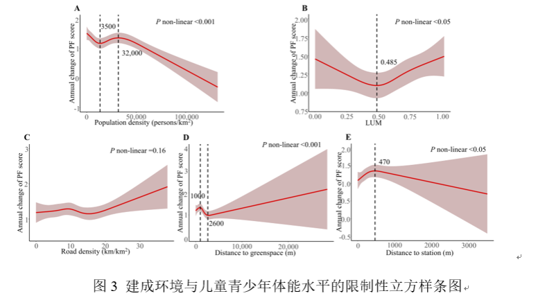 研究團(tuán)隊(duì)利用COHERENCE項(xiàng)目(陳亞軍教授課題組在廣州地區(qū)的一項(xiàng)大規(guī)模前瞻性隊(duì)列研究)2016/17至2019/20學(xué)年的隊(duì)列數(shù)據(jù),基于5Ds框架(Density, Diversity, Design, Destination accessibility, Distance to transit)獲取的居住地周邊建成環(huán)境數(shù)據(jù),分析了96,402名兒童青少年的體質(zhì)健康和人口統(tǒng)計(jì)信息。該研究采用了多層次的統(tǒng)計(jì)模型,考慮了學(xué)生、學(xué)校和行政區(qū)的層次結(jié)構(gòu),以準(zhǔn)確評估建成環(huán)境對體質(zhì)健康的影響。此外,研究還采用了限制性立方樣條(RCS)曲線來揭示建成環(huán)境與體質(zhì)健康之間的非線性關(guān)系,并進(jìn)行了閾值分析以確定不同建成環(huán)境特征對體質(zhì)健康影響的臨界點(diǎn)。