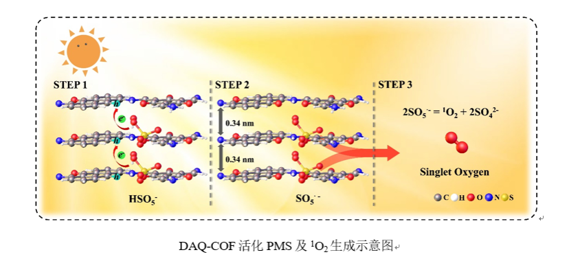 基于上述問題,中山大學王俊慧副教授和歐陽鋼鋒教授團隊報道了一種全新的1O2的生成策略,通過具有層間協同作用的框架結構有效拉近SO5·-的反應距離,從而實現高達14.8 μM s?1的1O2產生速率。實驗和理論計算表明所合成的新型層狀共價有機框架光催化劑(DAQ-COF)具有豐富的活性位點(C=O基團),DAQ-COF中的C=O基團是活化PMS的催化中心。激發態下空穴主要集中在C=O基團上,而PMS作為電子給體向空穴提供電子,從而形成SO5·-。隨后由于層間協同的相互作用,兩個SO5·-在距離較近的層間產生(小于0.34 nm),進而迅速結合產生1O2,這與報道的具有遠距離活性位點的催化劑有很大的不同。這種層間協同的概念是提高超短壽命自由基利用效率的一種創新而有效的策略,可以為綠色能源、化學合成、環境技術等各個領域提供新的思路。