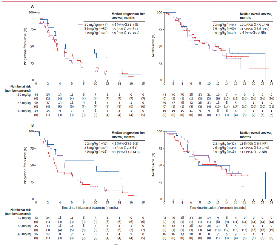 2020年12月24日至2023年2月23日期間,研究共納入27例晚期實體瘤患者(其中13例為胃癌/胃食管結合部腺癌,14例為胰腺癌)進行劑量遞增階段的研究,以及107名晚期胃癌或胃食管連接部癌患者進行劑量擴展階段的研究,這些患者均為多線標準治療后失敗的患者。研究分析了2.2 mg/kg、2.6 mg/kg和3.0 mg/kg三個劑量組胃癌/胃食管結合部腺癌患者的療效數據,在109例病灶可評價患者中,客觀緩解率(ORR)為29%,經確認的疾病控制率(DCR)為65%。其中,89例Claudin 18.2高表達(定義為≥20%腫瘤細胞中Claudin 18.2染色強度≥2+)的患者,經確認的ORR為35%,經確認的DCR為70%。所有Claudin 18.2高表達患者中,中位無進展生存期(PFS)為4.8個月,中位總生存期(OS)為11.8個月。研究最終確定CMG901的推薦劑量為2.2 mg/kg,為后續III期研究的開展提供了支持,提示CMG901有望在未來成為Claudin 18.2高表達胃癌/胃食管結合部腺癌患者的治療新選擇。