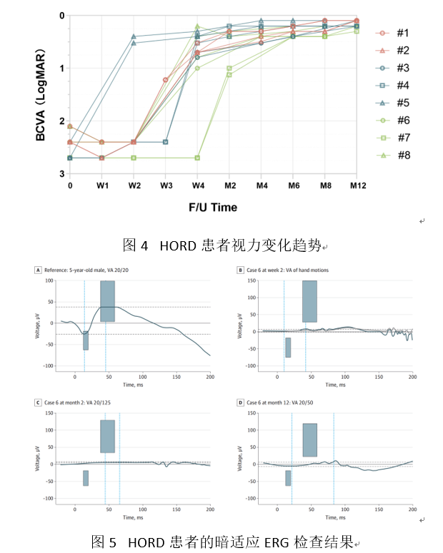患兒視力在急性期大多降至手動或以下,隨后在發病后的3-4周后開始恢復。發病12個月時,視力多數(87.5%)達到0.5或以上(圖4)。然而,全視野ERG提示視桿及視錐反應均完全熄滅(圖5)。