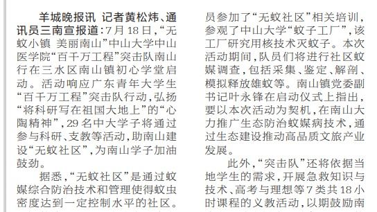 7月18日,“無(wú)蚊小鎮(zhèn) 美麗南山”中山大學(xué)中山醫(yī)學(xué)院“百千萬(wàn)工程”突擊隊(duì)南山行在三水區(qū)南山鎮(zhèn)初心學(xué)堂啟動(dòng)。活動(dòng)響應(yīng)廣東青年大學(xué)生“百千萬(wàn)工程”突擊隊(duì)行動(dòng),弘揚(yáng)“將科研寫(xiě)在祖國(guó)大地上”的“心陶精神”,29名中大學(xué)子將通過(guò)參與科研、支教等活動(dòng),助南山建設(shè)“無(wú)蚊社區(qū)”,為南山學(xué)子加油鼓勁。據(jù)悉,“無(wú)蚊社區(qū)”...
