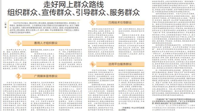 習近平總書記指出,要走好網上群眾路線,提高通過互聯網組織群眾、宣傳群眾、引導群眾、服務群眾的本領。讓互聯網成為我們同群眾交流溝通的新平臺,成為了解群眾、貼近群眾、為群眾排憂解難的新途徑,成為發揚人民民主、接受人民監督的新渠道。走好網上群眾路線,要充分發揮人才、技術、媒體、平臺等要素優勢,不斷回應...