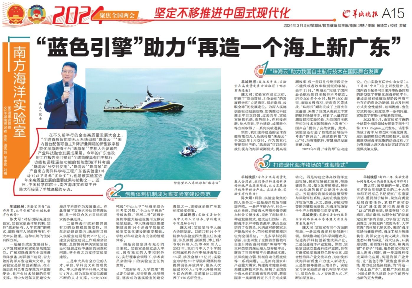 在不久前舉行的全省高質量發展大會上,“全球首艘智能型無人系統母船‘珠海云’”“國內首臺配備可自主升降折疊網箱的新型數字智能化深海養殖平臺‘珠海琴’”亮相大會設置的產業科技融合發展成果展。今年的廣東省政府工作報告專門提到“全球首艘具有自主航行功能和遠程遙控功能的智能型海洋科考船‘珠海云’號交付使用...