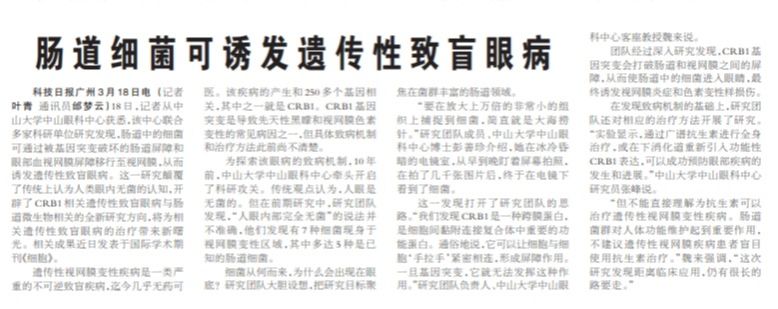 18日,記者從中山大學中山眼科中心獲悉,該中心聯合多家科研單位研究發現,腸道中的細菌可通過被基因突變破壞的腸道屏障和眼部血視網膜屏障移行至視網膜,從而誘發遺傳性致盲眼病。這一研究顛覆了傳統上認為人類眼內無菌的認知,開辟了CRB1相關遺傳性致盲眼病與腸道微生物相關的全新研究方向,將為相關遺傳性致盲眼病的...